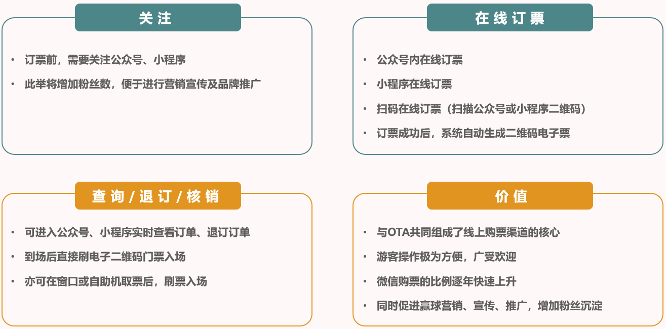 線上、線下全覆蓋,系統(tǒng)設(shè)計(jì)支持全渠道購(gòu)票途徑; 線下:售票窗口、自助機(jī),打印紙質(zhì)門票; 線上:OTA、旅行社、小程序、公眾號(hào)、官網(wǎng)、抖音等