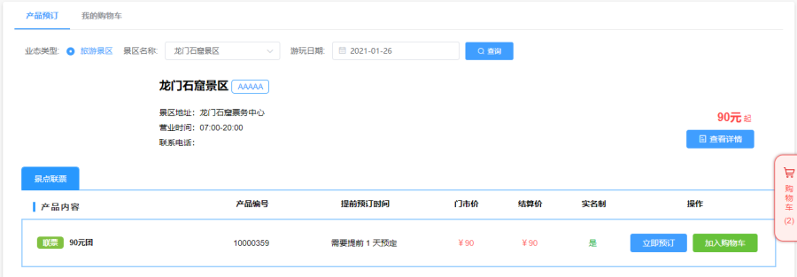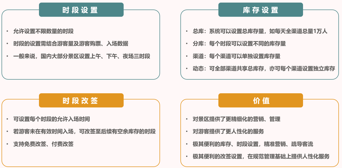 為用戶提供精細(xì)化營(yíng)銷,為游客提供更人性化選擇,時(shí)段設(shè)置、庫(kù)存設(shè)置等。 主要包括庫(kù)存設(shè)置、時(shí)段設(shè)置、過時(shí)改簽等功能,支持線上、線下一體化分時(shí)管控。